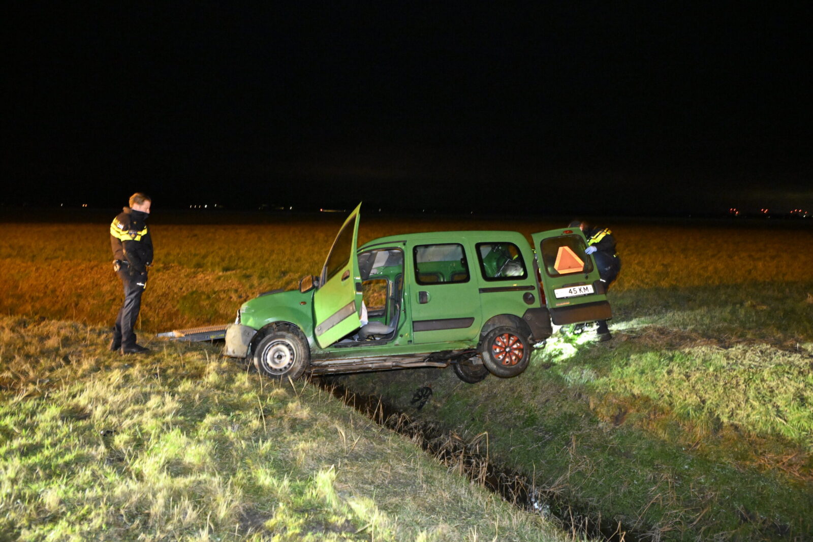 Ter plaatse bleek sprake van een eenzijdig ongeval. De bestuurder van een MMBS (45km voertuig) raakte door nog onbekende oorzaak van de weg en belandde in een naastgelegen sloot, ter hoogte van een fietsoversteekplaats. In het voertuig zaten twee personen: de bestuurder en een bijrijder, die beide gewond raakten. Het voertuig raakte zwaar beschadigd.